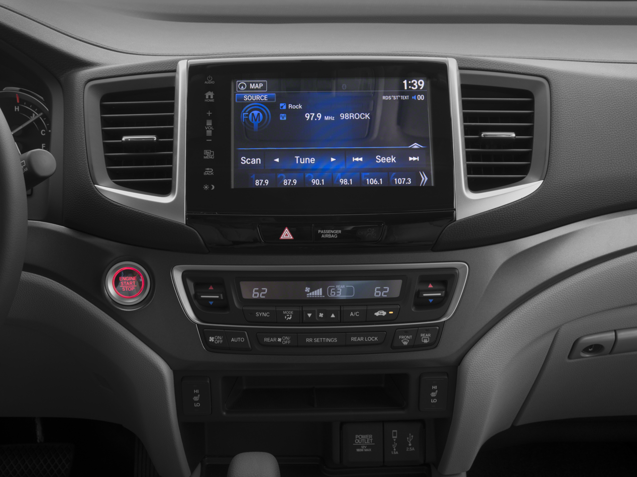 - Radio: AM/FM Audio System -inc: 225-Watt, 7 speakers including subwoofer, Bluetooth® HandsFreeLink, Bluetooth® streaming audio, MP3/auxiliary input jack, MP3/Windows Media Audio (WMA) playback capability, Radio Data System (RDS), Speed-Sensitive Volume Control (SVC), USB audio interface w/1.5-Amp and 2.5-Amp charging ports in front and 2.5-Amp charging port in center console, 8" display audio w/high-resolution WVGA (800x480) electrostatic touch-screen and customizable feature settings, HondaLink, Apple CarPlay, Android Auto, SMS text message function, Pandora compatibility and Song By Voice (SBV)